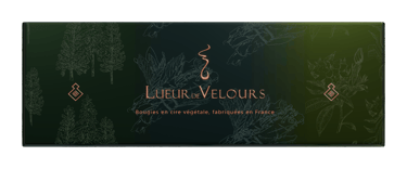 Je recherchais une police d’écriture fine et raffinée pour le logo de la marque. Je voulais trouver un équilibre entre différentes tailles de corps afin de mettre d’abord en avant le « L » et « V », puis les mots « Lueur » et « Velours », et enfin la préposition « De », celle-ci devant rester lisible. J’ai finalement ajusté l’espacement afin que dans un rectangle imaginaire, le « V » et la flamme soient parfaitement au centre.