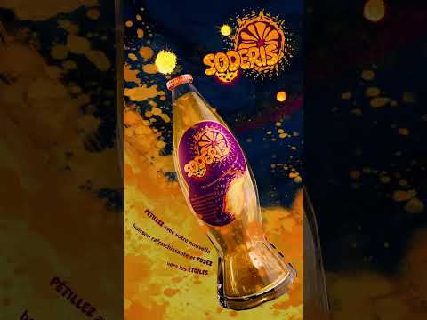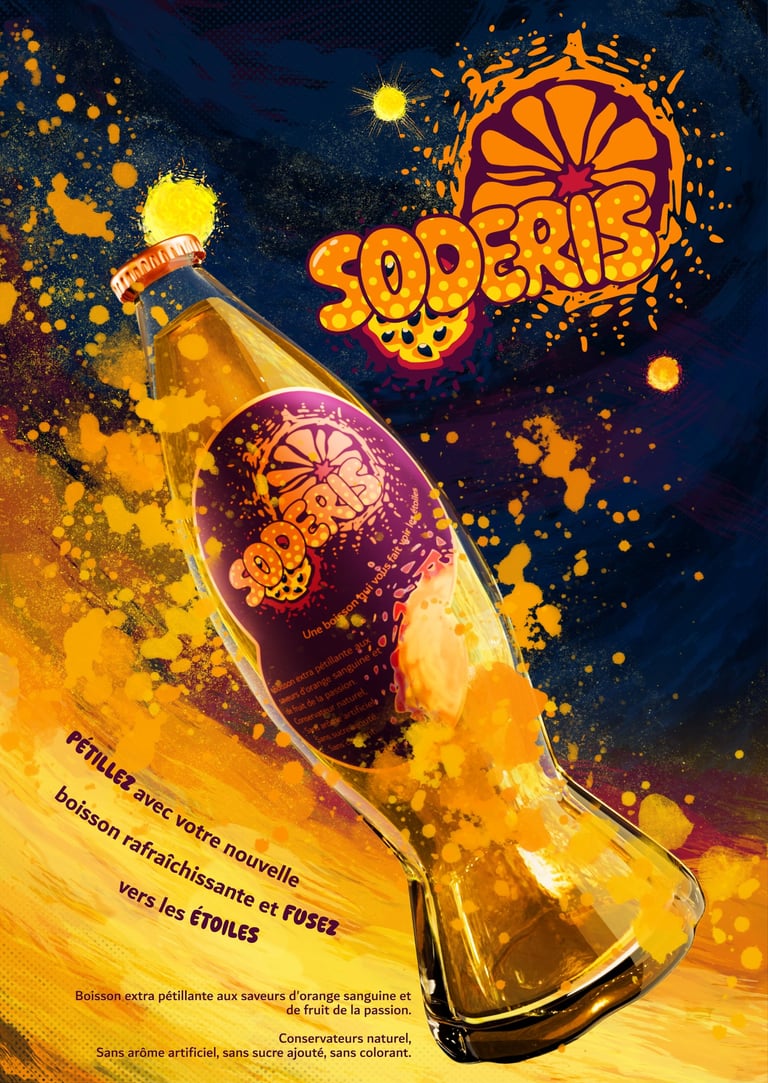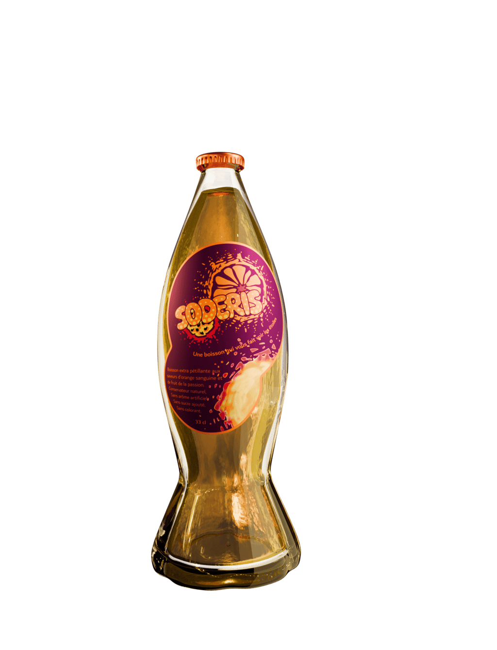 Ainsi la bouteille de SODERIS avec le jus de fruit pétillant à l'interieure. Le tout à été réalisé en 3D afin de l'intégrer dans l'affiche et dans la vidéo publicitaire.